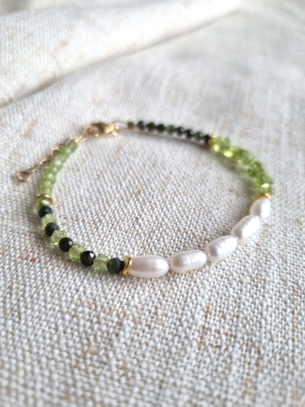 BIG 5 Edelsteinarmband - Peridot, Süßwasserperle und dunkelgrüner Turmalin